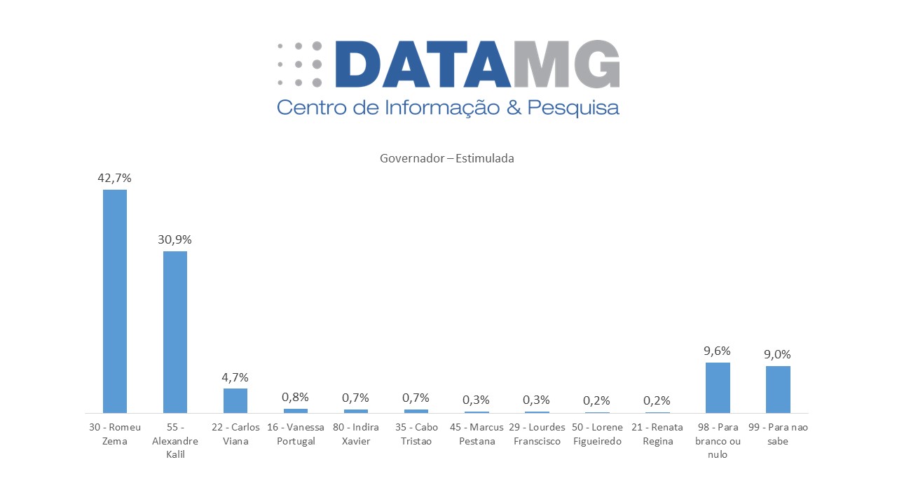O atual governador e candidato à reeleição, Romeu Zema (Novo) aparece em primeiro lugar com 42,7% das intenções de voto. Já Alexandre Kalil (PSD) tem 32,9%. Carlos Viana (PL) tem 4,3%. Os demais candidatos não somaram 1%: Vanessa Portugal (PSTU) tem 0,8%; Indira Xavier (UP), Cabo Tristão (PMD) têm 0,7% cada um. Lourdes Franscisco (PCO) e Marcus Pestana (PSDB), têm 0,3% cada. Lorene Figueiredo (PSOL) e Renata Regina (PCB) aparecem com 0,2% cada uma. Brancos e nulos são 9,6% e não sabem, 9,0%.