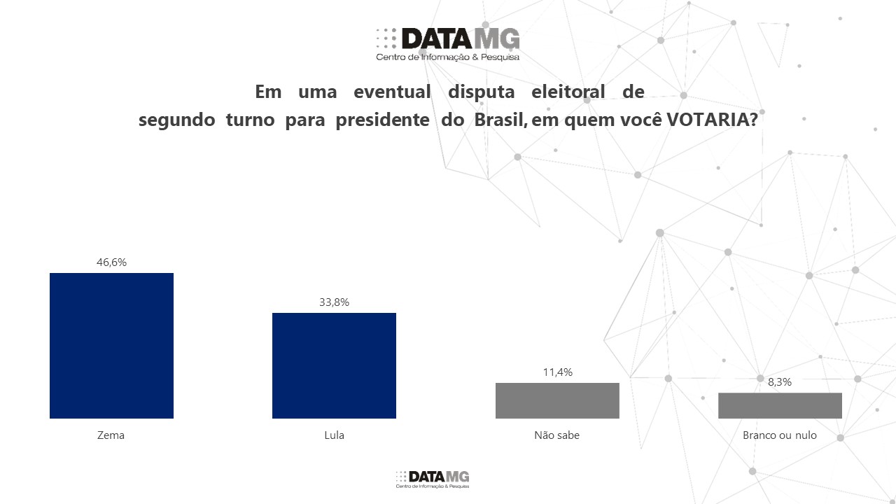 O Centro de Informação & Pesquisa — DATAMG ouviu 500 pessoas no Estado, na faixa etária a partir de 16 anos, entre os dias 7 e 8 de dezembro, e obteve resultados em números exatos. Se as eleições presidenciais brasileiras ocorressem hoje o vencedor seria Romeu Zema Neto (46,6%) na disputa contra Luiz Inácio Lula da Silva (33,8%). Nessa disputa, 11,4% não sabem em quem votar e 8,3% votariam em branco ou anulariam seus votos.