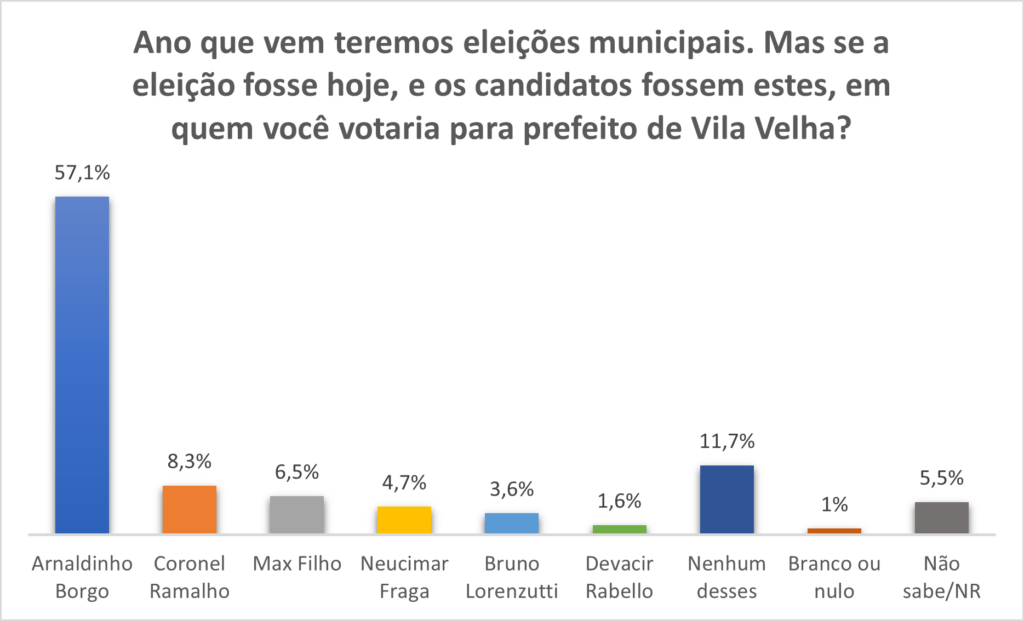 O folhaonline.es teve acesso aos dados da pesquisa “Avaliação da Gestão e Cenário Pré-eleitoral”, feita pelas empresas Brand Consultoria, do Espírito Santo, e DataMG, de Minas Gerais, nos dias 12, 13 e 14 deste mês. Foram ouvidos 506 eleitores de Vila Velha, que fizeram avaliações sobre a administração e o legislativo municipais, e também dos governos estadual e federal; responderam ainda sobre meios de informação, ideologia política e intenções de voto em possíveis cenários eleitorais. Nesse último bloco de perguntas, o atual prefeito Arnaldinho Borgo tem a maioria dos votos. Confira os resultados dos questionamentos em cenários pré-eleitorais: