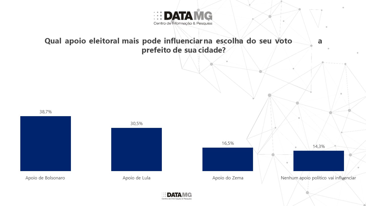 Em relação a qual apoio fará mais dierença nas eleições municipais do próximo ano, para 38,7% dos eleitores mineiros os candidatos apoiados pelo ex-presidente Jair Bolsonardo terão mais relevância, enquanto o apoio do presidente Lula será relevante para 30,5% dos mineiros entrevistados e os políticos apoiados pelo governador Zema (16,5%).