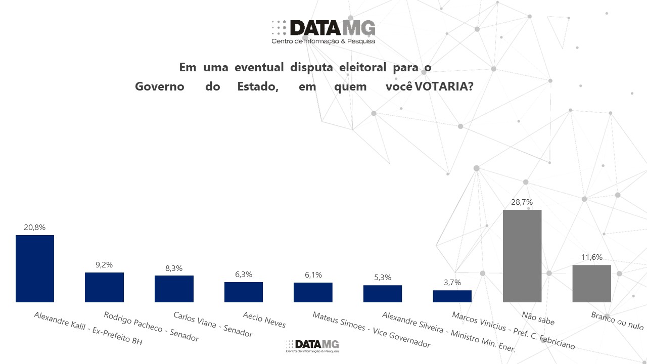 A disputa para governador de Minas Gerais em 2026 teria um quadro inverso no caso de direita x esquerda e Alexandre Kalil lidera com 20,8%, seguido por Rodrigo Pacheco (9,2%), Carlos Viana (8,3%), Aécio Neves (6,3%), Mateus Simões (6,1%), Alexandre Silveira (5,3%), 3,7%), não sabem (28,7%) e Branco/Nulo (11,6%). Em todas as questões deste levantamento a margem de erro é de 4,4%.